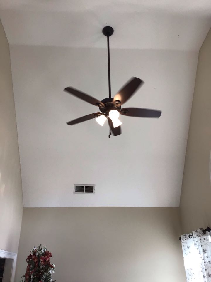 Install ceiling fan in living room on 16 ft ceiling. Used 10ft ladder. Customer was pleased with the install